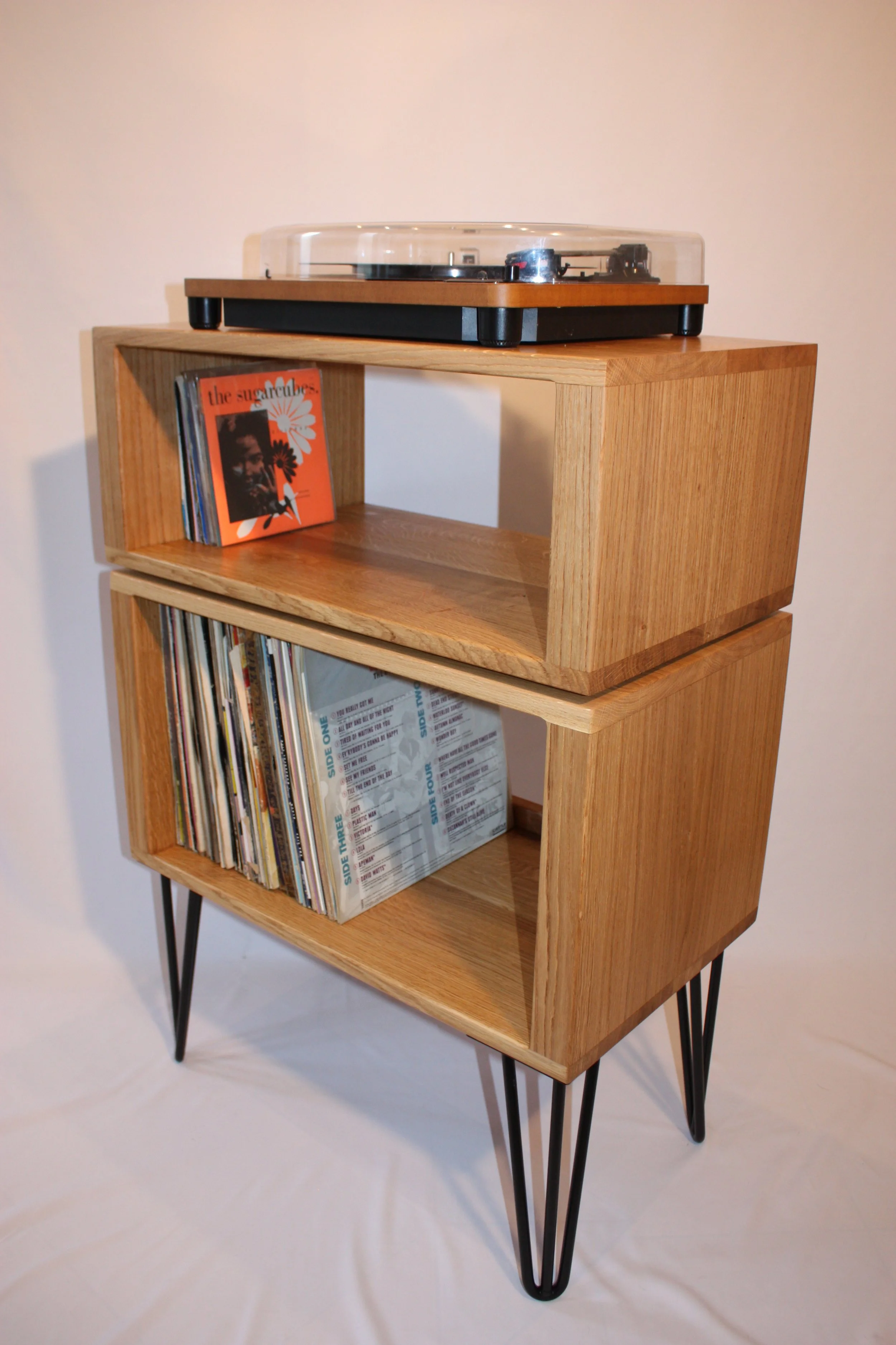Can be made to order from high-quality solid oak, ash, or walnut. It’s designed to fit a small vinyl record collection and has storage space for around 100 LPs, along with room for amplifier equipment above or smaller 7 inch records and a turntable on top. It also works perfectly as a side table or drinks cabinet.